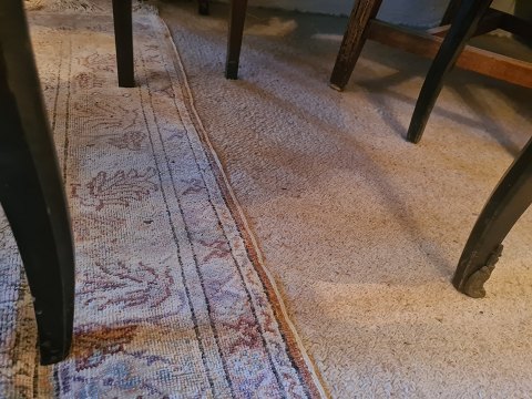 Kommode fra 1950'erne i finéret mahogni med marmor plade. Fremstår pæn og velholdt uden de store brugsspor. Dog mangler messingsko på venstre forben. (Billede)