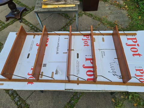 Reol til ophængning på væggen fra 1960'erne i finéret teak. Består 5 hylder á 80 x 20 cm. og 2 vanger á 198 cm. Pænt og ok velholdt dog med lidt brugsspor i form af overflade skrammer og uoriginale skruer. (Billede) |