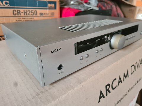 Integreret forstærker Arcam DiVA model A80. Testet og virker fint. Kommer med og i original emballage samt med strømførende kabel og fjernbetjening CR-389.
