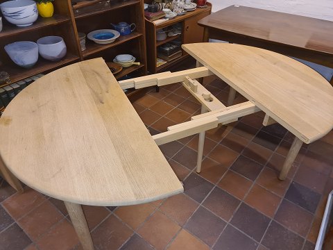 Kurt Østervig rundt spisebord udført i massiv eg samt 1 stk. tillægsplade også massiv eg. Fremstillet hos KP Møbler ca. 1980'erne. Mærket herfra.